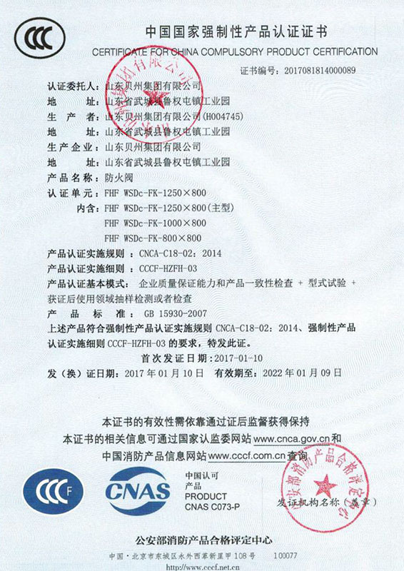 • 防火閥認(rèn)證證書